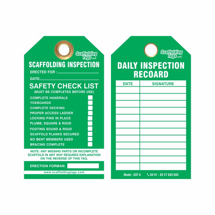 Green Scaffolding tags are designed as per the site / customer requirements and supplied with or without the customisation of company name / logo / location / language, etc. in different colours / captions as required by the regulatory authorities.